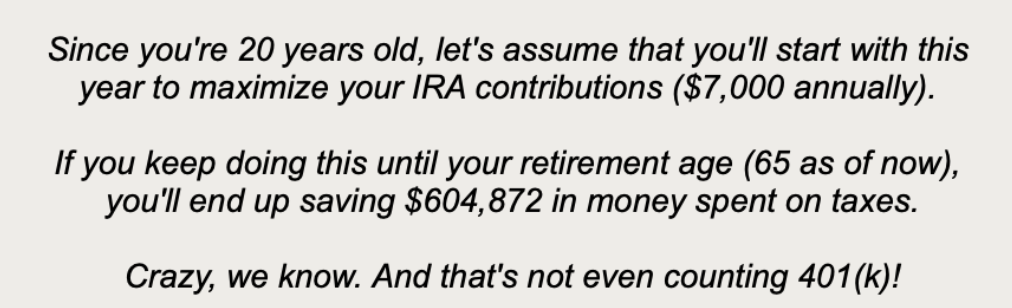 <div class="frich-tip">Frich tip: Check out this calculator that can help you visualize how much tax savings IRAs can generate over your lifetime!</div>